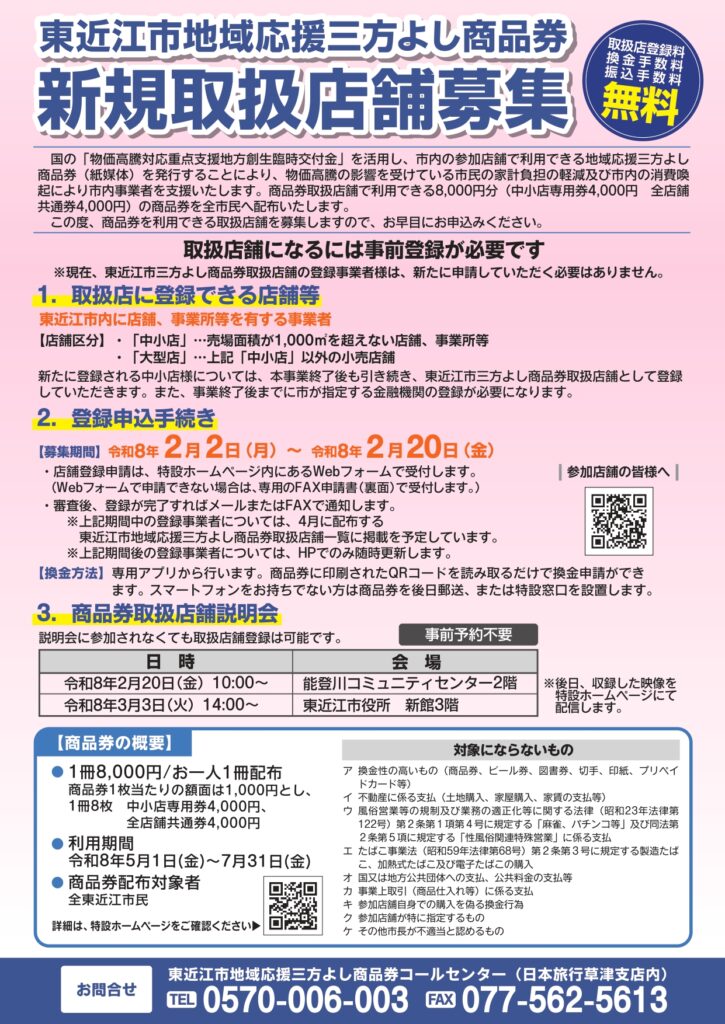 4月に全市民に配布される「東近江市地域応援三方よし商品券」の取扱いを希望する店舗・事業所を募集します。